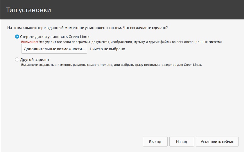 После этого, программа установки предложит приступить к разметке диска. Если Green Linux является единственной операционной системой, которую нужно запускать на этом компьютере, выберите Стереть диск и установить Green Linux