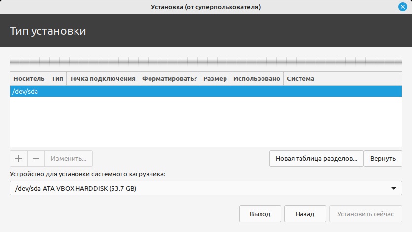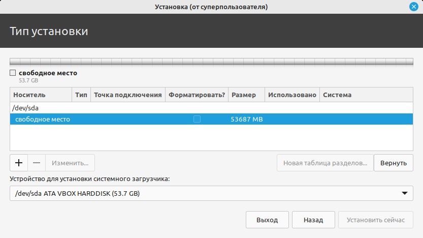Если вы устанавливаете систему на пустой чистый диск, то вам понадобится создать новую таблицу разделов. Если же на диске уже есть данные не делайте этого. Чтобы создать таблицу разделов нажмите кнопку Новая таблица разделов. Для создания нового раздела кликните по пункту свободное место, чтобы выделить его, а затем нажмите кнопку со значком +: