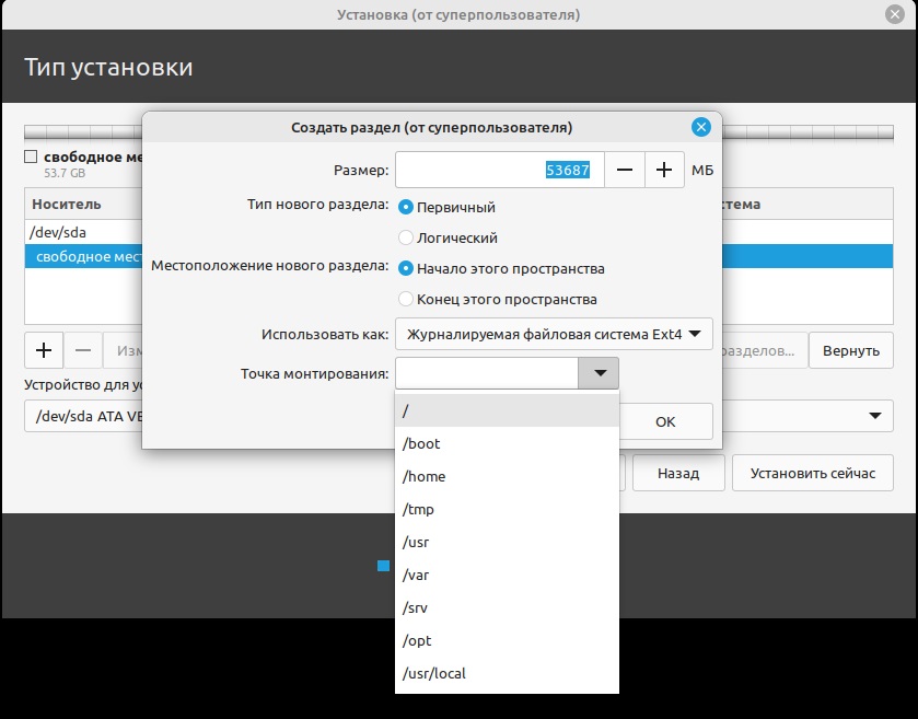 Первым делом необходимо создать корневой раздел, на который будет установлена операционная система. Для него надо не менее десяти гигабайт пространства, рекомендуется использовать 20 или 30 гигабайт, чтобы точно всё поместилось. Файловая система - ext4, а точка монтирования - /. Тип нового раздела и местоположение можно не менять.