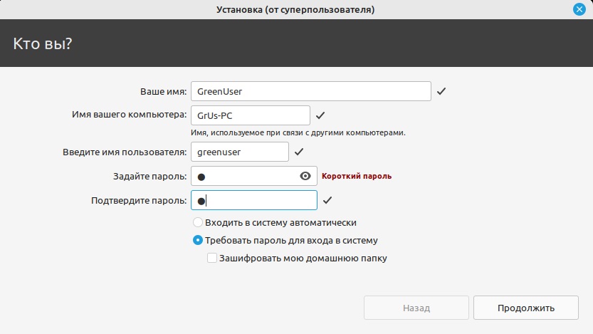 Следующим шагом будет создание имени пользователя и пароля. Введите имя пользователя, который будет использоваться для входа в систему, а также пароль для него. Если вы введете слабый пароль система предупредит об этом, но мешать продолжить установку не будет. Вы также можете здесь указать, что надо входить в систему автоматически без запроса пароля, а также зашифровать свою домашнюю папку.