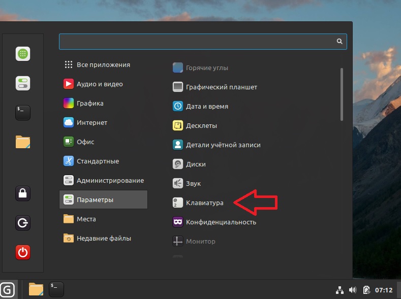 Начнем настройку, пожалуй, с раскладки клавиатуры. Для этого переходим в меню Пуск. В разделе Параметры находим параметр под названием Клавиатура: