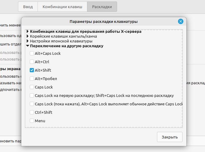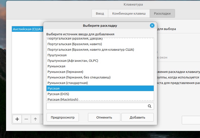 Далее переходим во вкладку Раскладки, нажимаем на крестик внизу и добавляем необходимый язык, в моем случае это Русский: