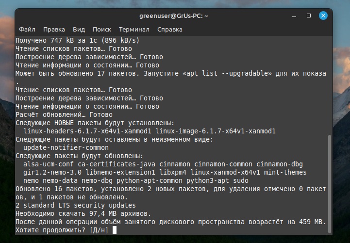 Перед началом дальнейшей настройки Green Linux, желательно обновить систему, это можно сделать командой: