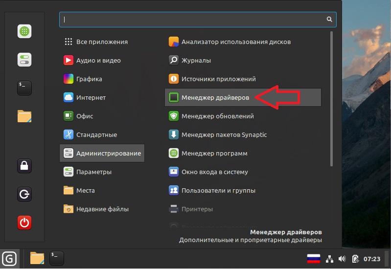 Для установки драйверов в Green Linux переходим в меню Пуск. В разделе Администрирование, есть утилита Менеджер драйверов.