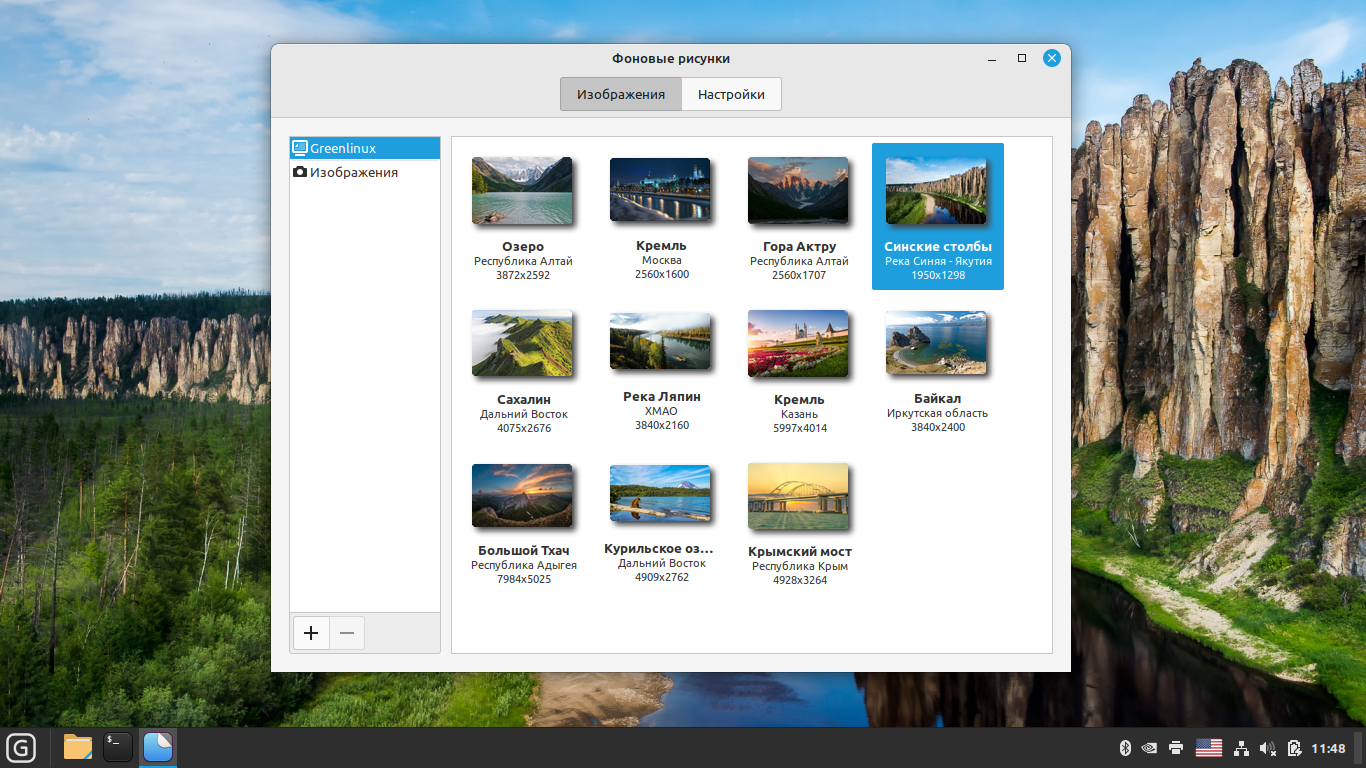 Для того, чтобы сменить обои, кликните правой кнопкой мыши по свободному месту на рабочем столе, вызвав тем самым контекстное меню. Выберите пункт Изменить фон рабочего стола. Появится стандартный файловый менеджер, с помощью которого можно выбрать понравившееся изображение из готового набора Green Linux или из папки Изображения. Кликните мышкой по выбранному графическому файлу, таким образом сделав его автоматически фоновым рисунком вашего рабочего стола: