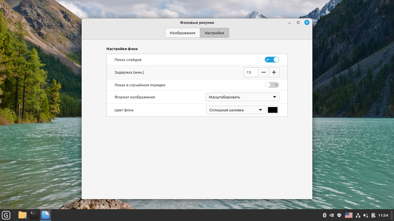 В этом же окне можно перейти на вкладку Настройки. Там имеется параметр Показ слайдов с выбором времени задержки между сменами фонового изображения. В результате активации показа слайдов изображения из выбранного каталога будут сменяться автоматически (по умолчанию 15 минут).
