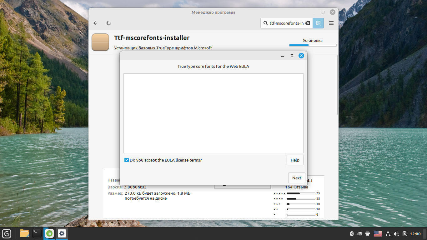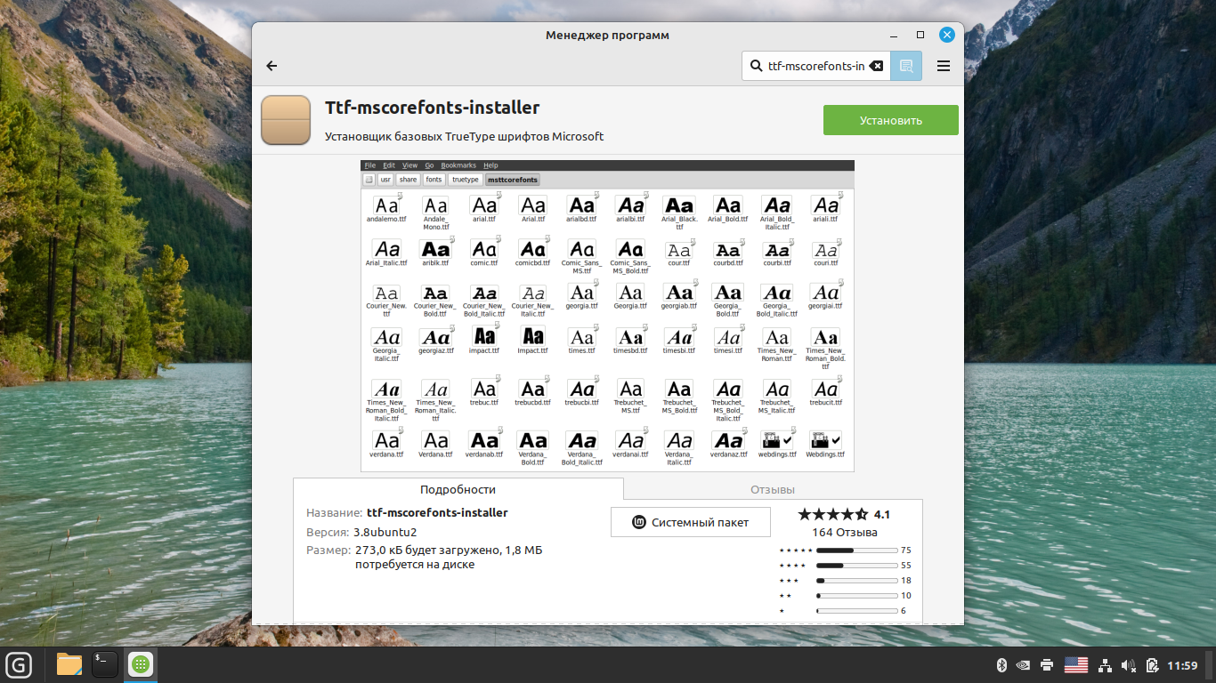 В строке поиска введём mscore. В списке результатов поиска появится нужный нам пакет — Ttf-mscorefonts-installer. Установим его.