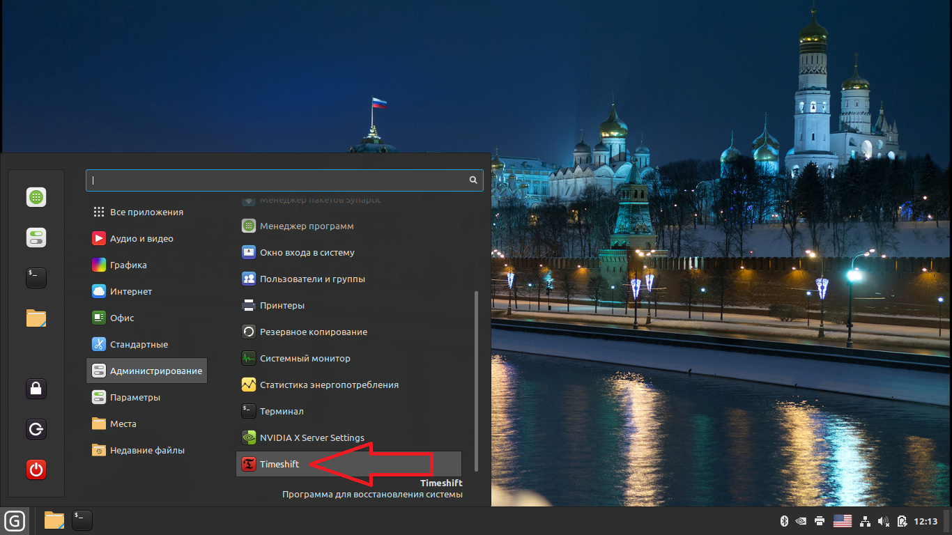 Теперь настроим резервное копирование. Для этих целей в Green Linux используется программа TimeShift. В меню Пуск. В разделе Администрирование найдем TimeShift.