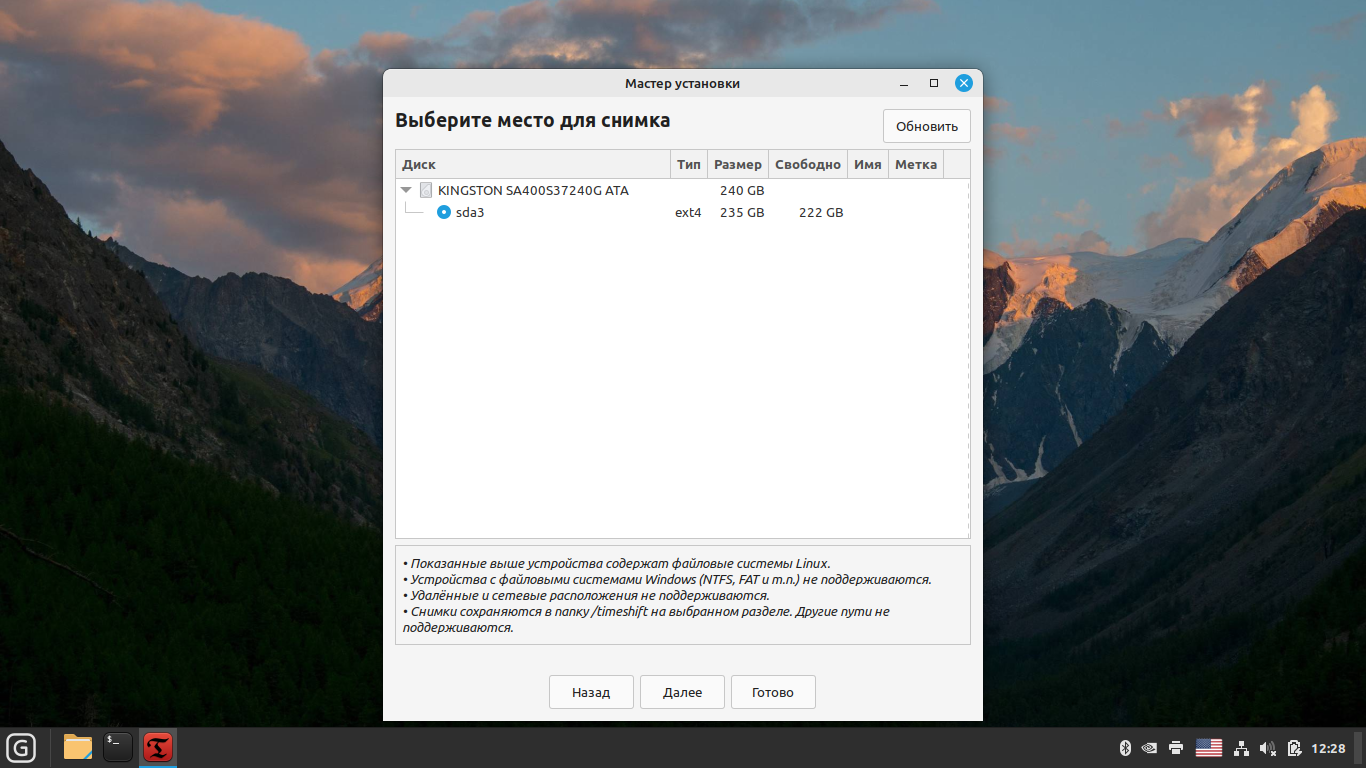На второй вкладке следует указать место для хранения будущих снимков. TimeShift автоматически ищет возможные накопители, подключённые к компьютеру. В данном случае в наличии лишь жёсткий диск: