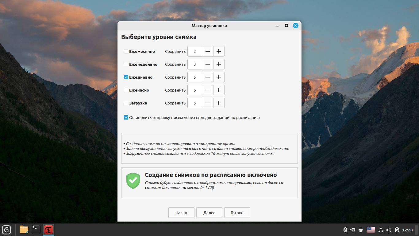 Далее можно создать график создания резервных копий. Помимо прочего, можно указать так называемые уровни создания снимков. Если вы прочитали справку, то обратили внимание на то, что в режиме RSYNC первый снимок представляет собой полную копию всех системных файлов, а все последующие содержат только ту часть, которая была изменена со времени предыдущего резервирования.