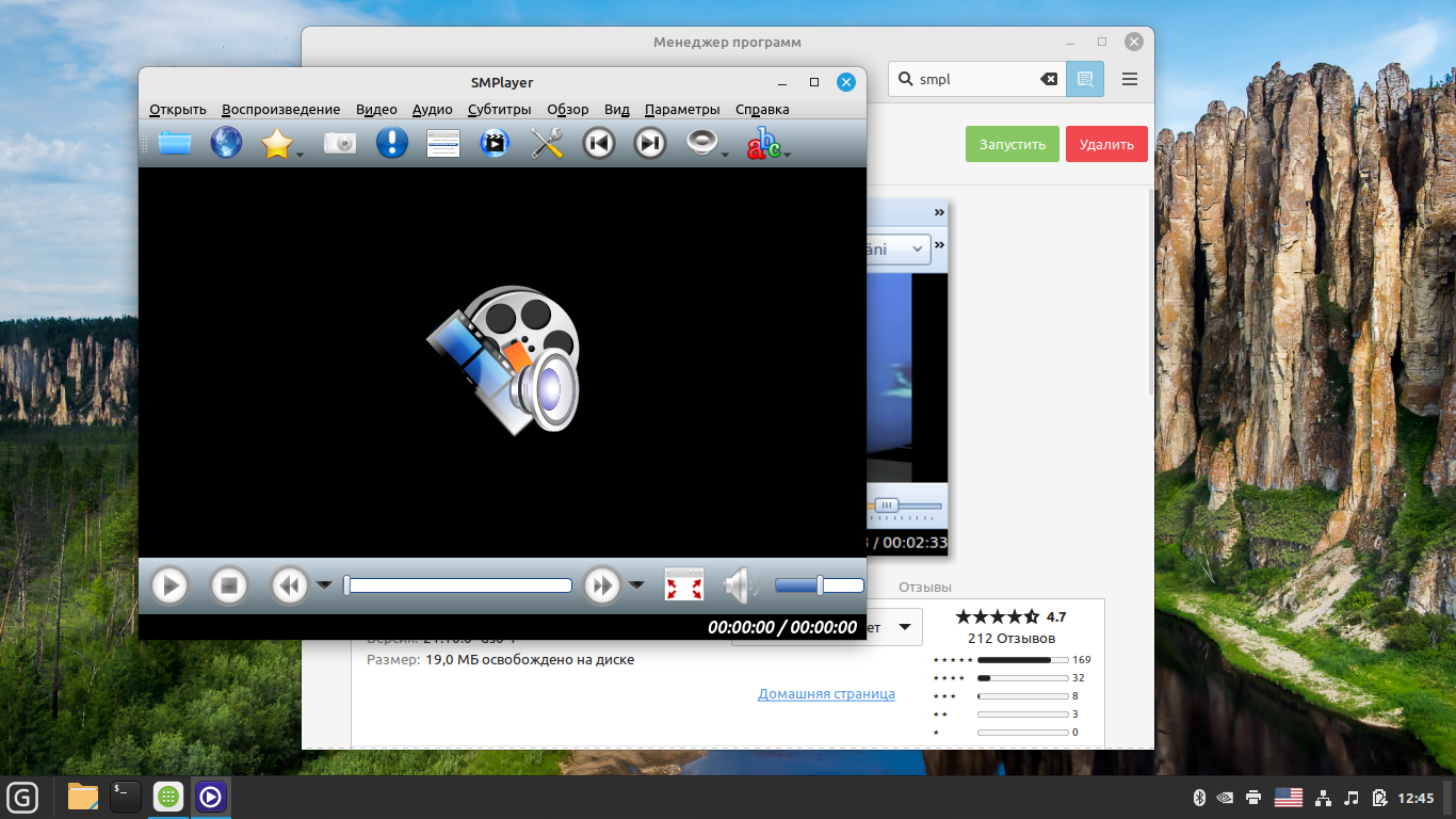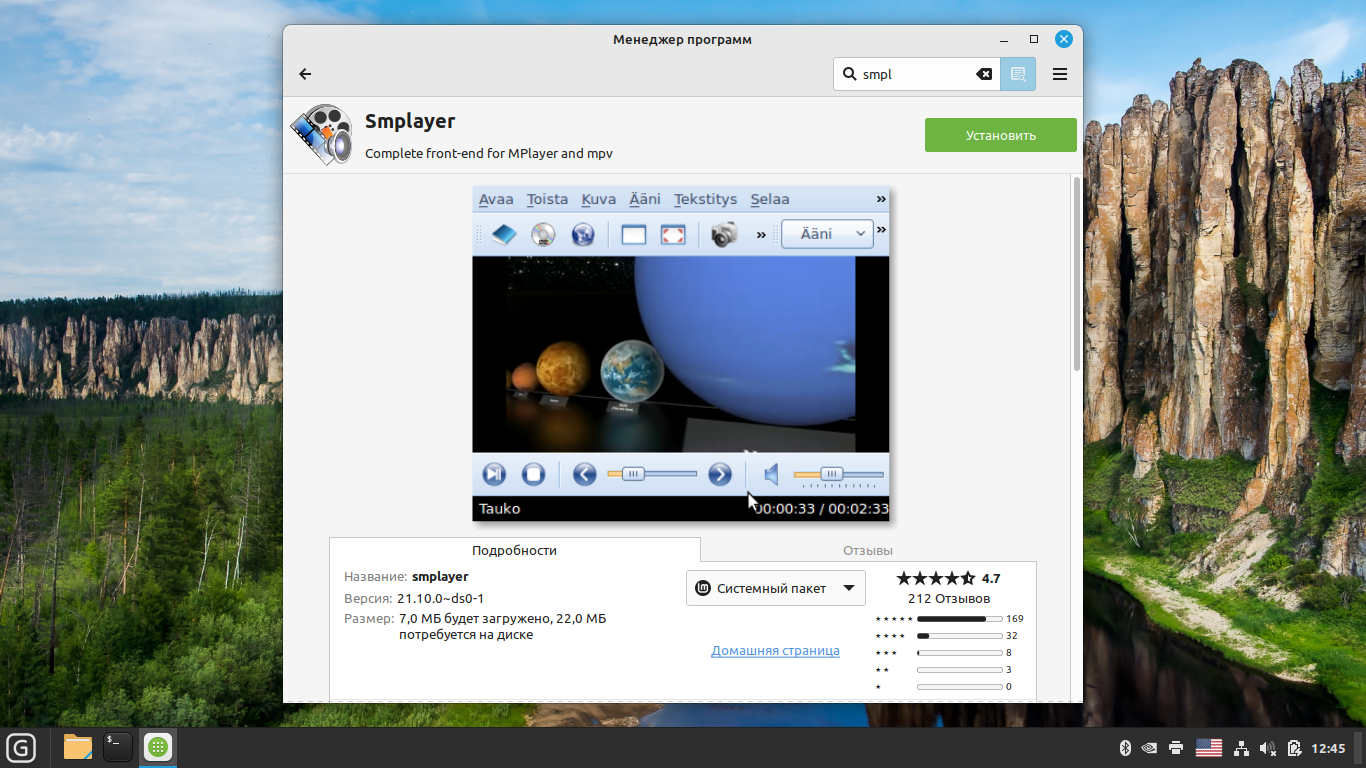 Green Linux располагает достаточно развитой графической оболочкой. Воспользуемся ею. Для этого в меню Пуск запустим Менеджер программ. Для примера установите медиаплейер Smplayer. В строке поиска введём smplayer.