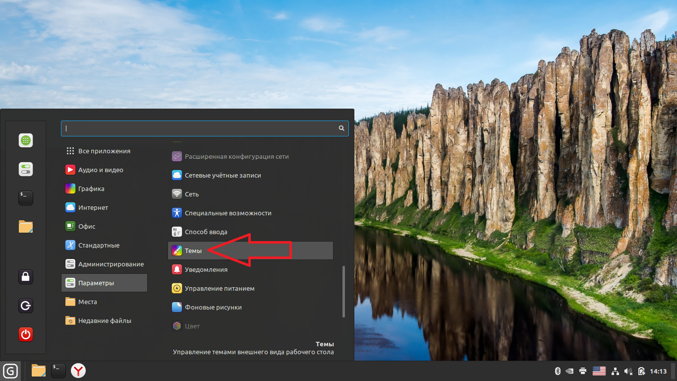 Для придания графическому интерфейсу своего особенного стиля можно скачать и установить темы. Для этого переходим в меню Пуск. В разделе Параметры находим параметр под названием Темы.