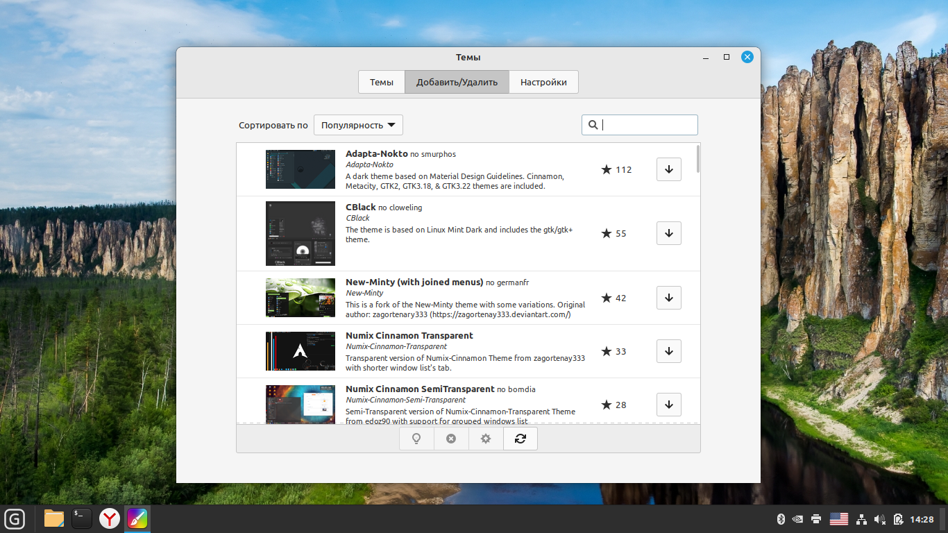 Перейдя на вкладку Добавить/Удалить, можно загрузить из Интернет другие темы, для своего удобства отсортировав их список по популярности, имени или дате создания: